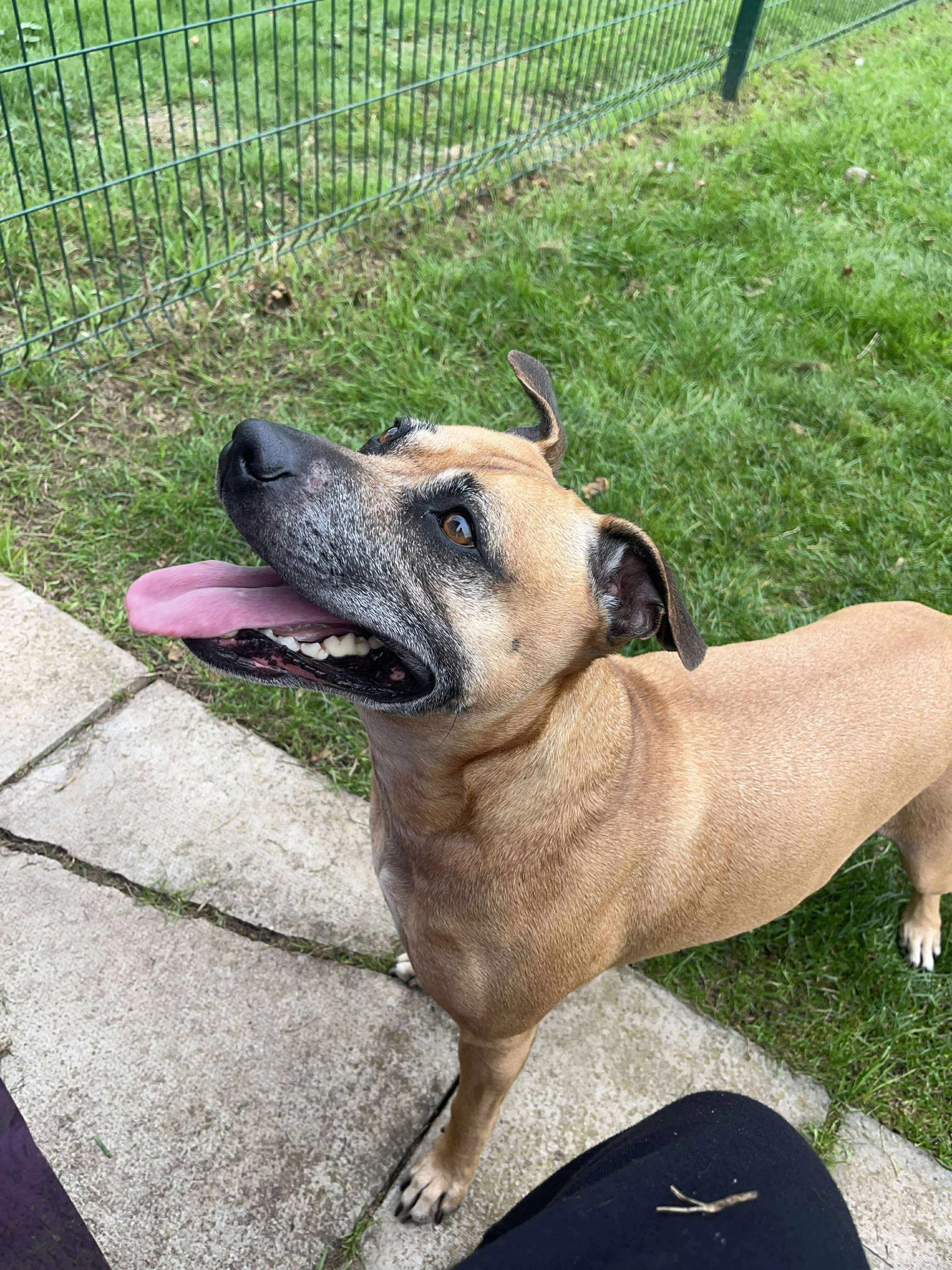 Tilly is a 6-year-old Staffie cross with a big heart and a story of resilience. She’s had a challenging past, moving through several homes before coming into our care. When she first arrived, she was nervous, unsure, and would often cower. With patience, regular exercise, and plenty of love, she began to trust us and truly blossom.